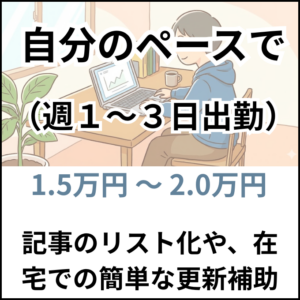選べるワークスタイル(在宅・短時間OK) 「毎日通うのはハードルが高い」「外に出るのが怖い」という方もご安心ください。週1日・短時間からのスタートはもちろん、完全在宅(テレワーク)での業務も可能です。まずは「自分にできる範囲」から、少しずつ自信を積み重ねていきましょう。
